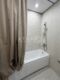 Ванная комната выполнена в плитке спокойного бежевого цвета, на полу уложен керамогранит. Установлена акриловая ванна, электрический полотенцесушитель, потолок натяжной с современным встроенным карнизом для шторы.